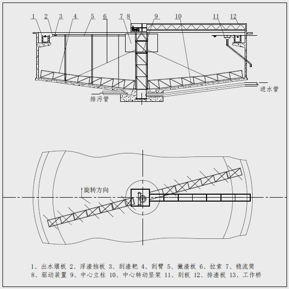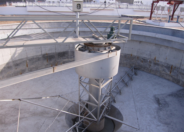 該設備采用中心傳動、垂架式,污水從進水管流入導流筒擴散后,均勻的向周邊呈輻射狀流出,呈懸浮狀的污泥經沉淀后沉積于池底,驅動裝置帶動中心豎架旋轉,并帶動刮臂及刮泥板轉動,將污泥從池周刮向中心集泥槽后,靠池內靜水壓由排泥管排出池外。水面的浮渣通過撇渣裝置撇向池邊,再由刮渣耙刮進排渣斗內排出池外。而上清液則通過出水堰板溢入出水槽內排出。
