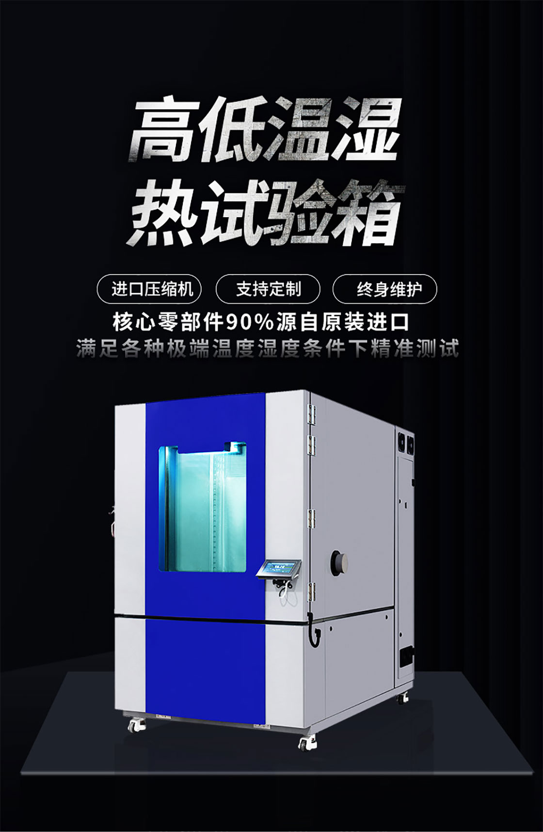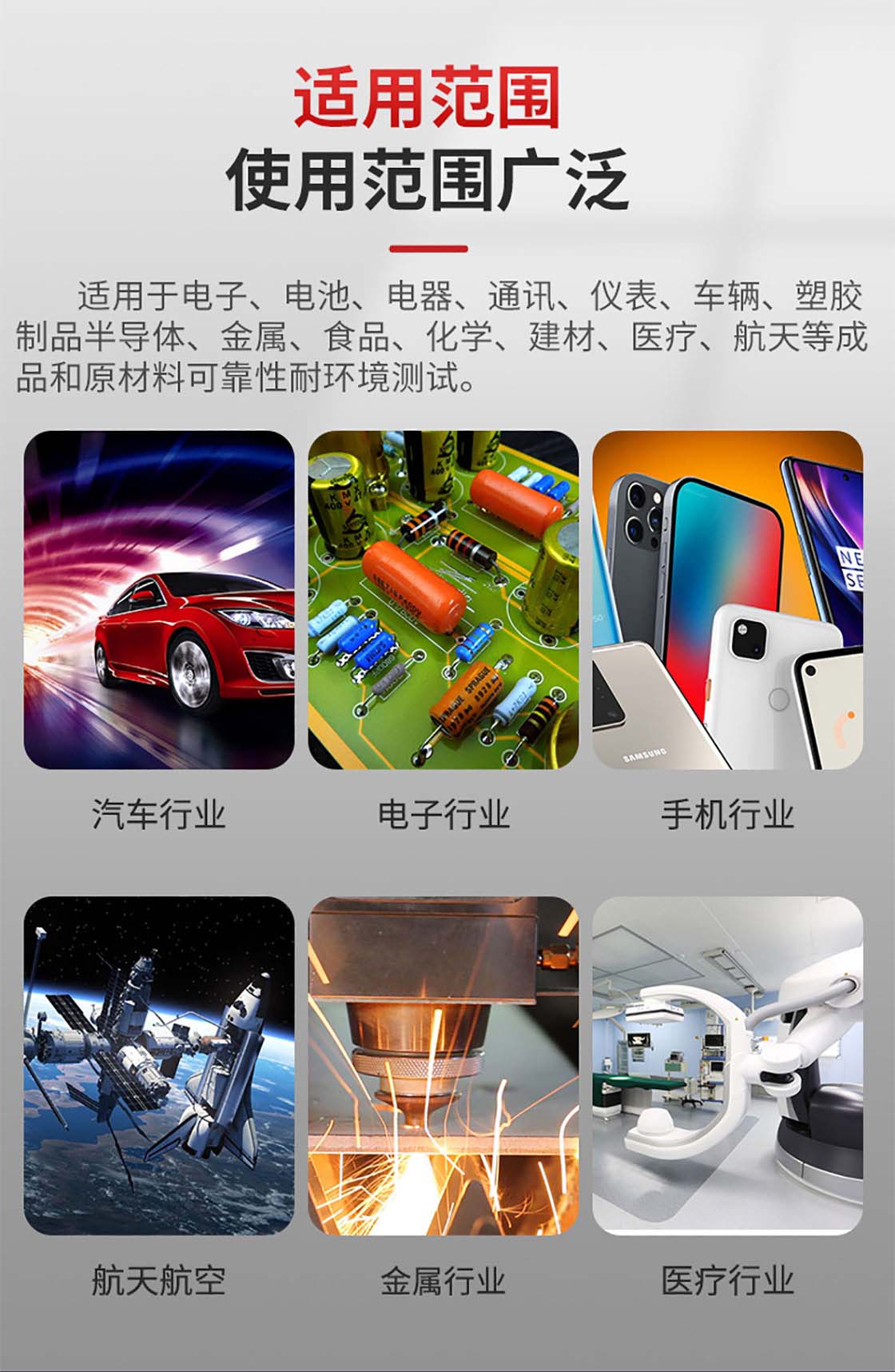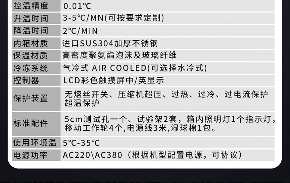 高低溫試驗箱:適用于工業產品高溫、低溫的可靠性試驗。對電子電工、汽車摩托、航空航天、船舶兵器、高等院校、科研單位等相關產品的零部件及材料在高溫、低溫(交變)循環變化的情況下,檢驗其各項性能指標。