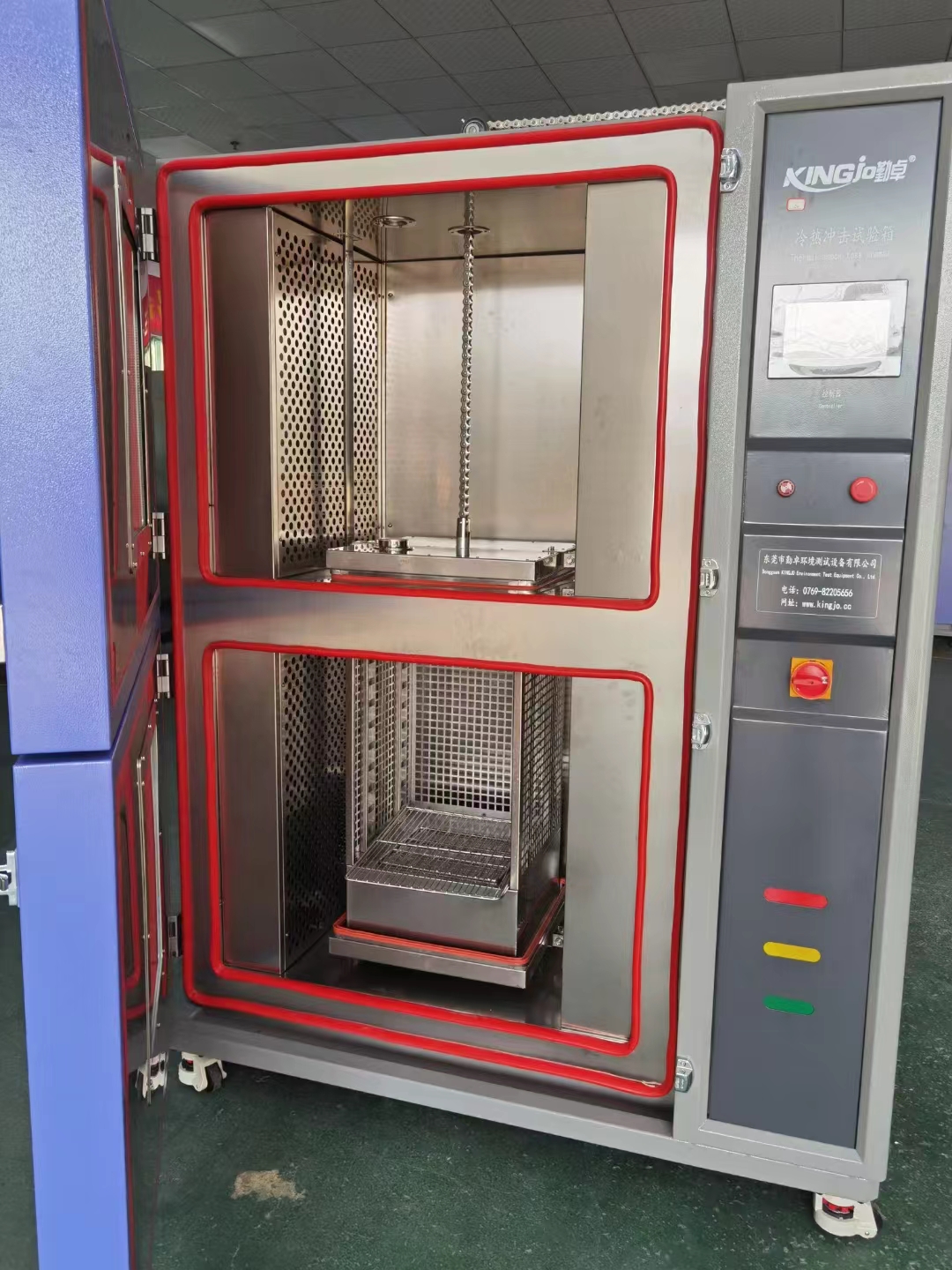 兩箱式冷熱沖擊試驗(yàn)箱在高低溫室內(nèi)切換轉(zhuǎn)移,采用吊籃移動(dòng)式控制,轉(zhuǎn)換時(shí)間短符合國(guó)標(biāo)要求,溫度恢復(fù)時(shí)間短,溫變速度快,設(shè)備整體結(jié)構(gòu)緊湊,體積小,采用兩箱法,提高了工作室的溫度均勻性。