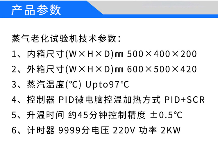 參數要求:1、內箱尺寸(W×H×D)㎜ 500×400×2002、外箱尺寸(W×H×D)㎜ 600×500×4203、蒸汽溫度(℃) Upto97℃4、控制器 PID微電腦控溫加熱方式 PID+SCR5、升溫時間 約45分鐘控制精度 ±0.5℃6、計時器 9999分電壓 220V 功率 2KW蒸氣老化試驗機特點:1、內、外箱體材質:SUS304不秀鋼制作。外觀美觀,不易老化2、水位控制