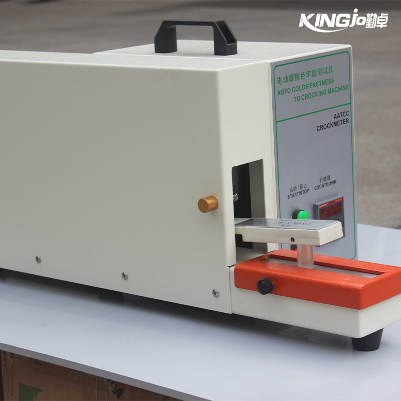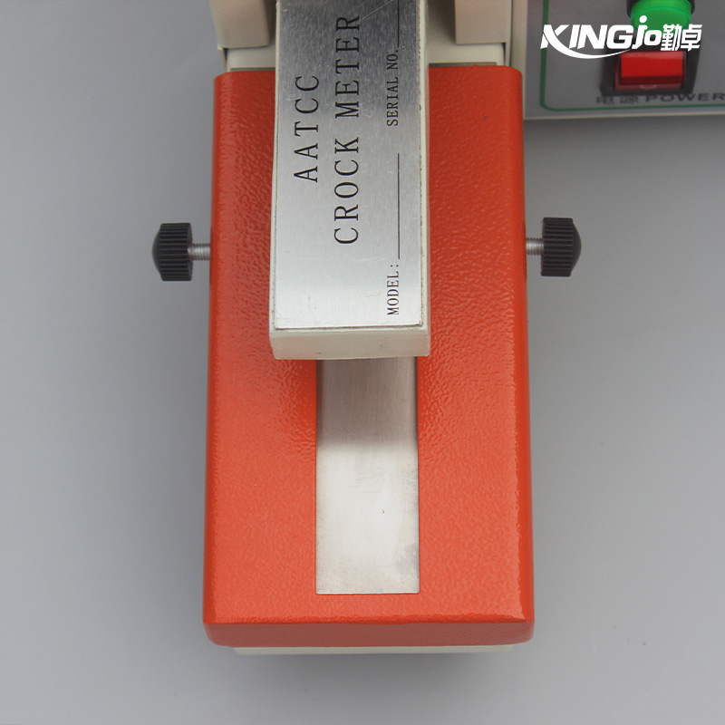 本儀器為整體式設計,主要由底座、摩擦傳動機構和計數器組成,用試樣夾將試樣和砂紙固定在底座的一側,搖動手柄使裝有白棉布的摩擦頭在試樣上作規定行程的往復運動,使白棉布和試樣相互摩擦,摩擦十次后觀察并用灰卡對比評定白棉布上的粘色程度,對織物試樣的染色或表面涂層的穩定性作出評判,為材料的評估和選擇提供參考數據。本儀器適用于紗線、色織、印染等紡織品以及玩具產品上或其內部的所有織物。