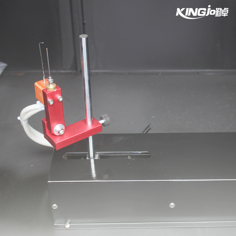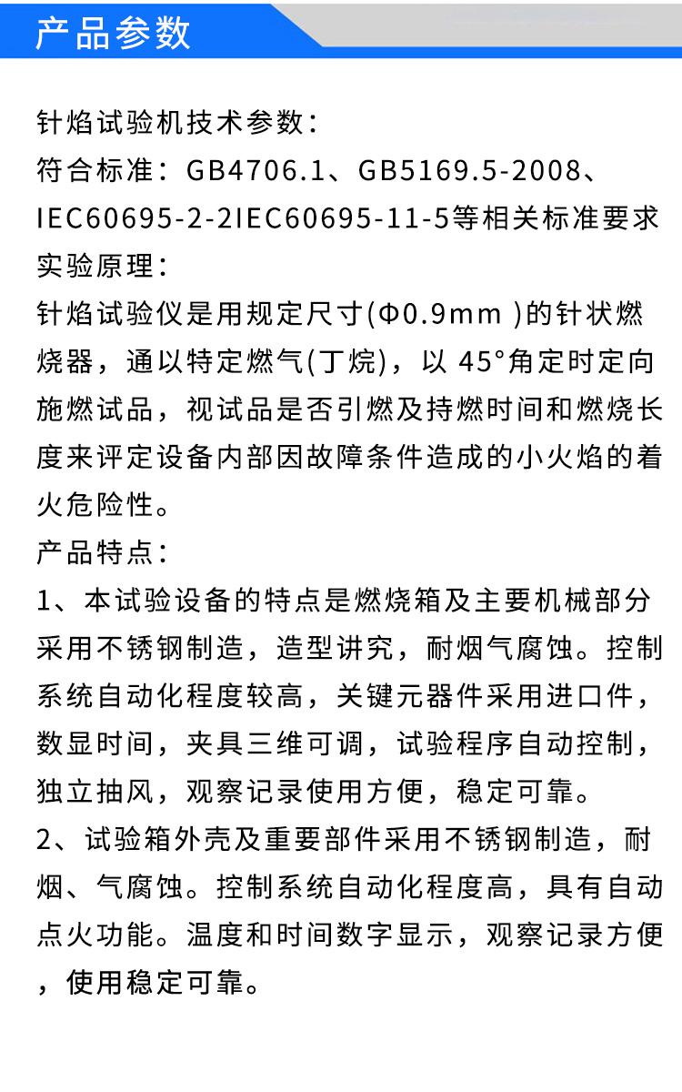 針焰試驗儀是用規定尺寸(Φ0.9mm )的針狀燃燒器,通以特定燃氣(丁烷),以 45°角定時定向施燃試品,視試品是否引燃及持燃時間和燃燒長度來評定設備內部因故障條件造成的小火焰的著火危險性。