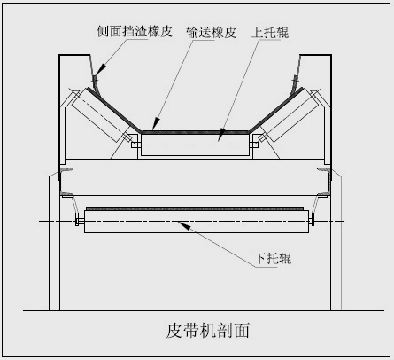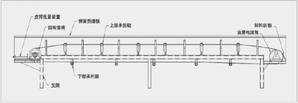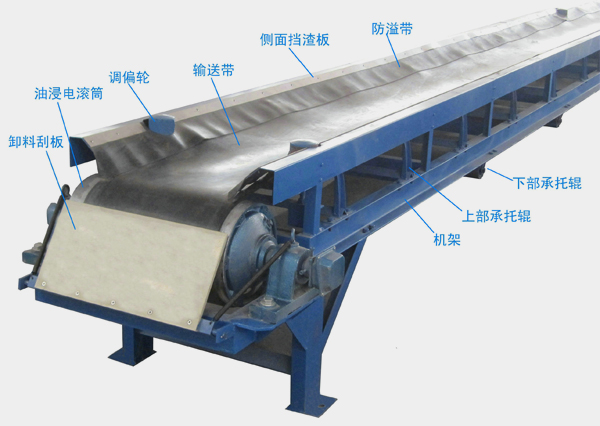帶式輸送機主要由油浸電滾筒、副滾筒、機架、輸送帶、上部承托輥、下部承托輥、調偏滾、裝緊裝置、卸料板等組成。